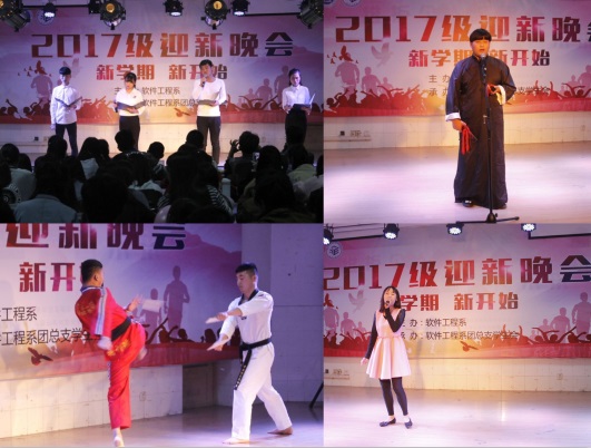 本网讯 流光溢彩迎新夜,心心连新齐飞扬。为了迎接2017级新生的到来,展现软件工程系学子风采,10月15、16日晚,主题为“新学期 新开始”的软件工程系2017级迎新晚会分别在本部大阶梯教室一和丰收佳苑C301、C401教室拉开帷幕。软件工程系主任陈平、党总支副书记王莉娟、副主任陈向东、团总支书记曾甜以及软件工程系的老师和同学们参加了本次晚会。