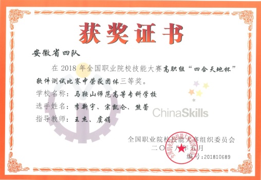 本网讯 2018年全国职业院校技能大赛(高职组)软件测试赛项于5月30日在河南省许昌市许昌职业技术学院隆重举行,本次大赛共有来自全国29个省(市、自治区)的96支队伍,288名选手参赛。师专软件技术专业李新宇、宗凯仑和熊蕾三位同学组成参赛团队,与来自全国各地高手激烈比拼,最终获得三等奖的好成绩。