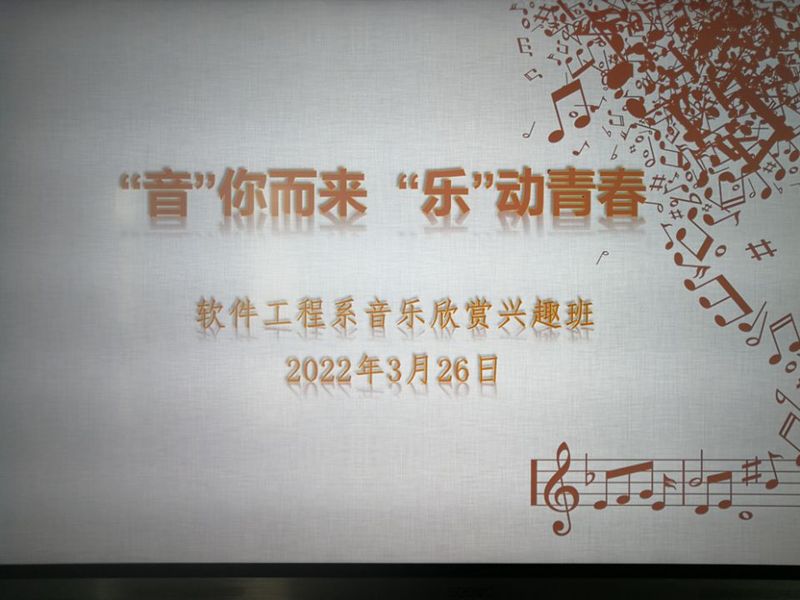 本网讯 聆听音符律动,叩击美丽心灵,3月26日晚,软件工程系在行知楼601举办音乐欣赏兴趣班活动。马宇飞老师为学生们带来一场妙趣横生的听觉盛宴。