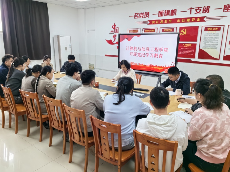 4月17日下午,计算机与信息工程学院党总支组织全体党员在学院党员活动室开展党纪学习教育。会议由学院党总支书记王莉娟主持。