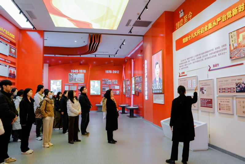 马鞍山市党风廉政教育展厅总面积1500平方米,以 “江碧映山青 廉洁润诗城” 为主题,巧妙融合教育性、警示性与艺术性。展厅内,丰富的图文展板系统梳理了党风廉政建设的发展历程与政策要求,一个个典型案例直观呈现了违纪违法的惨痛代价;专题视频通过真实画面与深刻剖析,让参观者沉浸式感受廉洁从政、廉洁从教的重要意义;各类廉洁文化展品则将传统廉洁文化与现代廉政理念相结合,传递出 “以廉为荣、以贪为耻” 的价值导向。同时,展厅创新运用 “声光电” 技术与沉浸式体验装置,通过互动问答等形式,打破传统教育模式的局限,让廉洁教育、纪法教育、警示教育更加生动鲜活、深入人心。 参观过程中,师生党员们在讲解员的引导下,有序驻足观看每一处展陈内容。参观结束后,全体师生党员在党风廉政中心的宣誓展厅整齐列队,面向鲜红的中国共产党党旗,举起右拳庄严宣誓。“我志愿加入中国共产党,拥护党的纲领,遵守党的章程……” 铿锵有力的誓言不仅是对党的忠诚承诺,更是对坚守廉洁初心、践行使命担当的郑重表态。