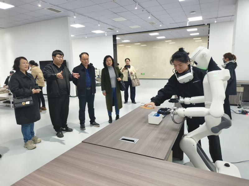在马鞍山图灵小镇,夏慧新一行先了解小镇的整体规划和公司入驻情况,然后参观了博领智能科技有限公司,了解数据采集、训练机器人场景,负责人介绍数据采集的注意事项等,双方围绕人才培养、就业实习等合作事项进行深入交流。