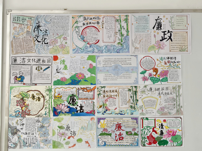 活动伊始,同学们踊跃响应,围绕“廉洁”核心,结合历史典故、时代楷模、廉洁格言等内容,将廉洁理念与绘画、书法、排版设计相融合。有的以漫画形式描绘校园廉洁小故事,警示同学们严守纪律、诚信做人;有的摘抄范仲淹、林则徐等先贤的廉洁诗词,配以古典纹样彰显清廉风骨;还有的结合新时代廉洁要求,设计出“清风伴我行”、“廉洁润心田”等创意板块,让廉洁理念以更鲜活的形式呈现。一张张手抄报主题鲜明、构思精巧、色彩丰富,既展现了同学们的创意巧思,更彰显了大家对廉洁精神的深刻理解与认同。